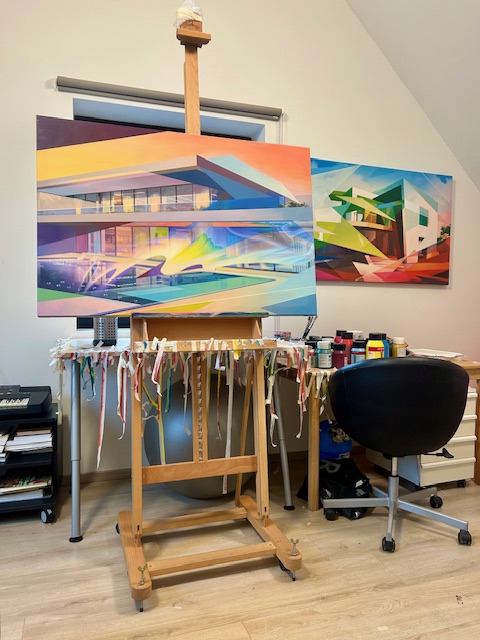 “Mijn werk start altijd vanuit een digitaal beeld, meestal een foto van een structuur of architecturaal gegeven. In Photoshop ga ik hiermee aan de slag en gebruik ik dat als mijn basis. Dit geeft me de vrijheid om te experimenteren met lagen, kleuren, en structuren zonder direct vast te zitten aan de fysieke beperkingen van een doek. Wat ik interessant vind aan het digitale proces is de flexibiliteit: je kunt elementen in- of uitschakelen en snel van kleur veranderen. Wanneer ik uiteindelijk tevreden ben met het digitale ontwerp, print ik het uit op doek. Nadien begint het pas en voeg ik met verf extra diepte en textuur toe, wat de digitale lagen verder versterkt.”
